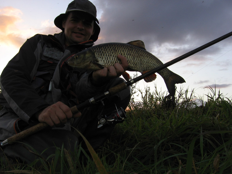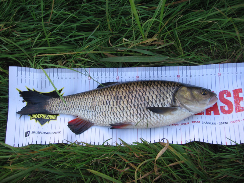 A co do zacięcia, to kleń i kilka cm większy boleń, na wyrób własny. Z kleniem nie było tak łatwo, bowiem wziął zza kilku metrowego pasa grążeli i musiał lecieć ślizgiem z podniesioną nad ziele głową by się nie zaplątać. Dopiero pod samym brzegiem gdy już nastawiałem podbierak, dał nura w przybrzeżne ziele i najzwyczajniej w świecie spiął się. Nie mogłem uwierzyć w to co się stało, ale chwila patrzę i oczom nie wierzę. Kleń wbił się głową w trzciny pod moimi nogami, więc nie namyślając się długo schyliłem się i złapałem go rękoma. Zazwyczaj w podobnej sytuacji ryby uciekają na otwartą wodę, tym razem mi się poszczęściło i dane mi było zrobić pamiątkowe zdjęcie z pechowcem. Poza tym miałem jeszcze trzy niezacięte brania prawdopodobnie jazi.